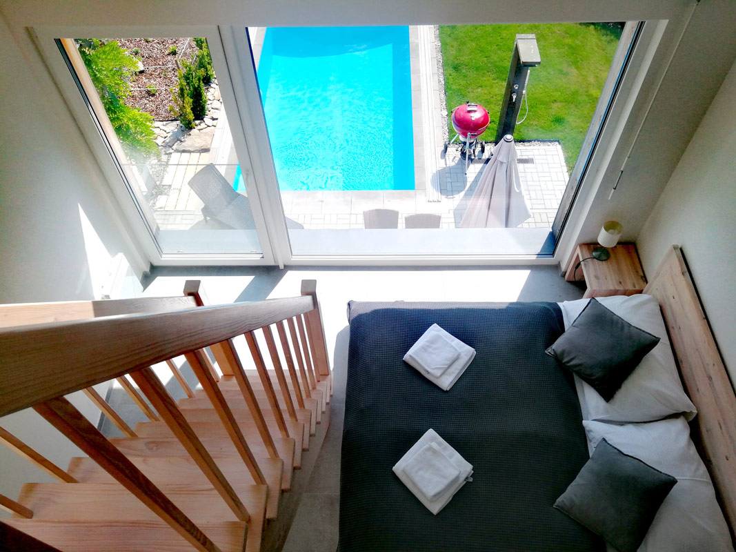 Třípodlažní apartmán pro 4-6 osob s celkovou vnitřní plochou 82 m2, infrasaunou, vlastním zastřešeným venkovním bazénem o rozměru 6 x 3 m a hloubce 120 cm (využití cca květen-září), venkovní solární sprchou a terasou s krásným výhledem na Lipno.