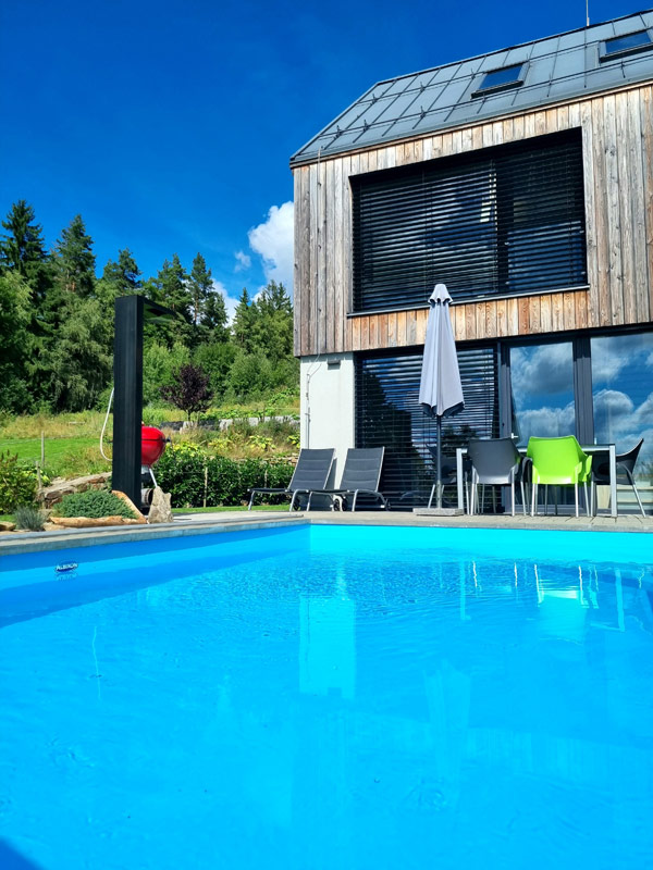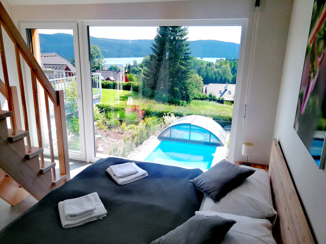 Třípodlažní apartmán pro 4-6 osob s celkovou vnitřní plochou 82 m2, infrasaunou, vlastním zastřešeným venkovním bazénem o rozměru 6 x 3 m a hloubce 120 cm (využití cca květen-září), venkovní solární sprchou a terasou s krásným výhledem na Lipno.