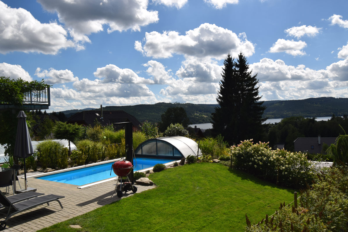 Výhled na Lipno a bazén u apartmánu A6 (Green Stone Lipno)