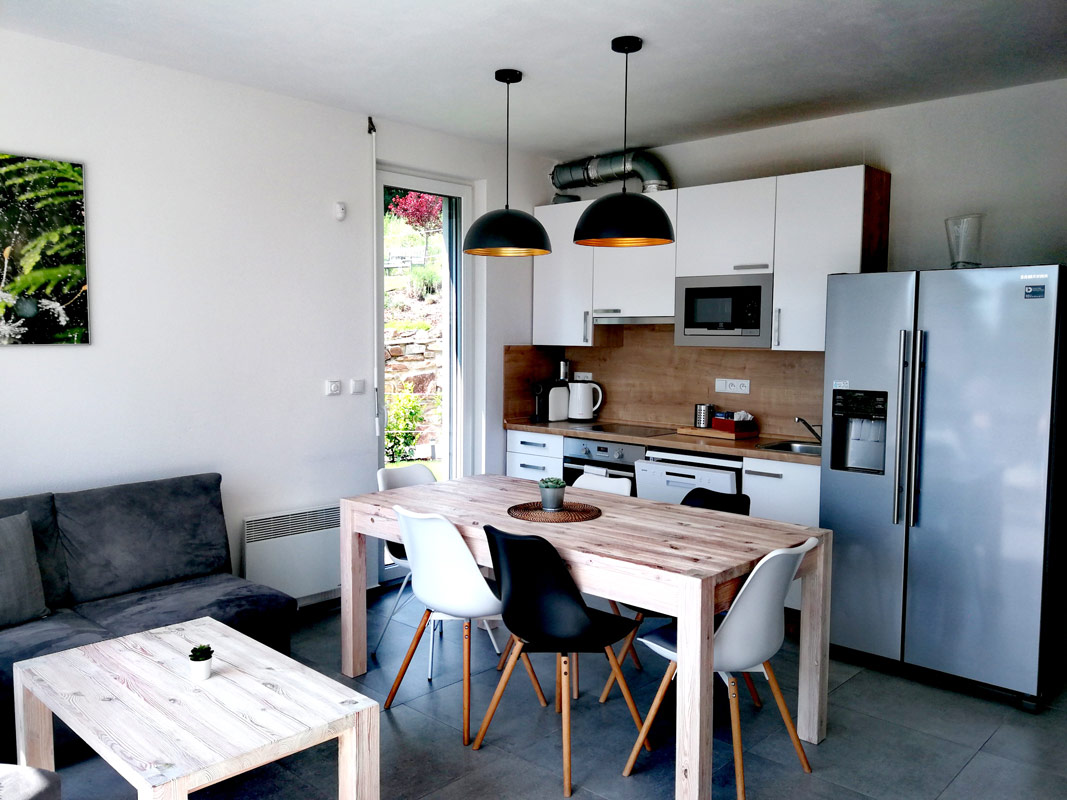 Obývací pokoj s kuchyňským koutem apartmánu A6  (Green Stone Lipno)