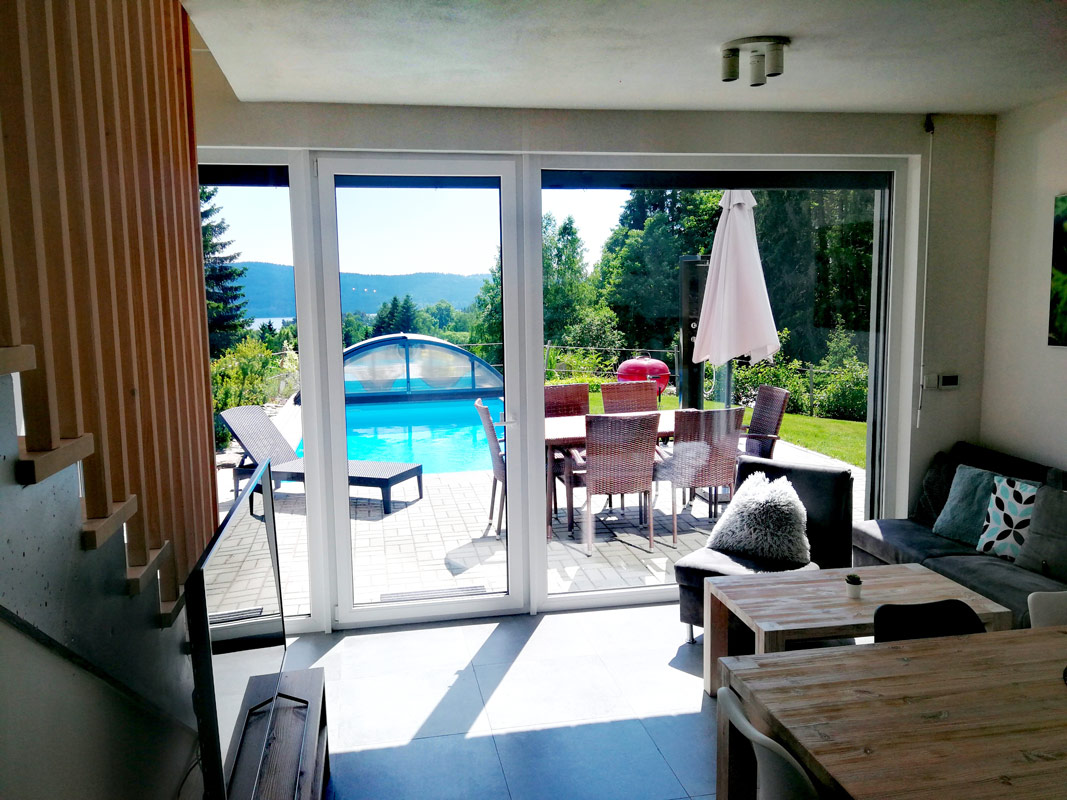 Výhled na bazén a Lipno z apartmánu A6 (Green Stone Lipno)